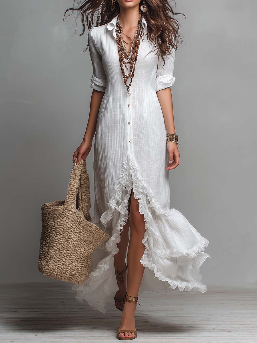 Boho-Leinen-Baumwoll-Maxikleid mit Knopfleiste und Rüschensaum